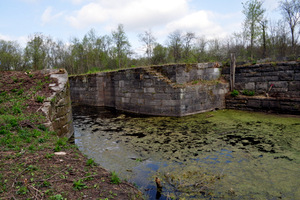 It was an exciting day. My dad and I showed up at 9:00am with our work clothes and tools. In order to get to Lock 19 we had to walk 1 mile on a nature trail. Heck, I was already tired by the time I got there. As you can see from the pictures below, there was a lot of work to do. We spent most of the time removing 100 years of dirt, grass, vines, and weeds from the stone walls and walking area. We also spread mulch at the base of the lock.